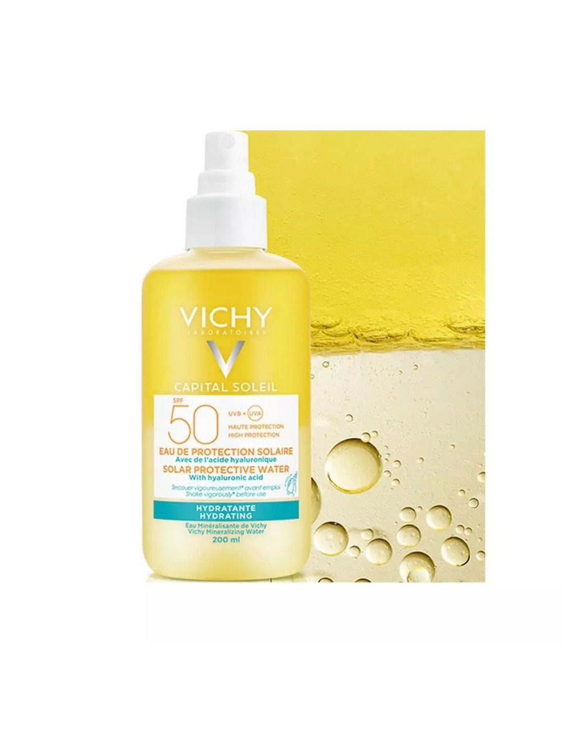 Grâce à l'association unique d'un filtre UVA/UVB à large spectre et d'une formule sensorielle, VICHY CAPITAL SOLEIL Eau de Protection Solaire Hydratante SPF 50 est une combinaison unique d'un filtre UV à large spectre et d'une formule sensorielle.